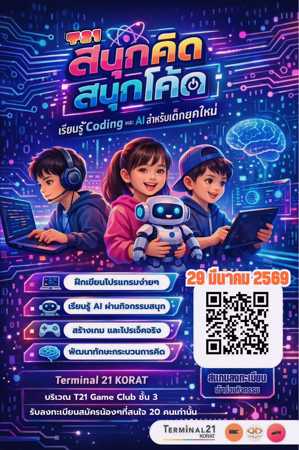 1. หลักการและเหตุผล ในปัจจุบัน เทคโนโลยีดิจิทัลและปัญญาประดิษฐ์ (Artificial Intelligence: AI) มีบทบาทสำคัญต่อการดำรงชีวิต การศึกษา และการทำงานในอนาคต เด็กและเยาวชนจึงจำเป็นต้องมีทักษะด้านการคิดเชิงคำนวณ (Computational Thinking) และทักษะการเขียนโปรแกรม (Coding) เพื่อให้สามารถปรับตัวและแข่งขันในโลกยุคดิจิทัลได้ การเรียนรู้ด้าน Coding และ AI…