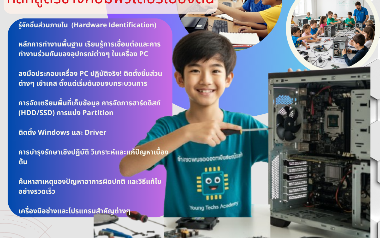 ในยุคดิจิทัลปัจจุบันที่เทคโนโลยีคอมพิวเตอร์ได้เข้ามามีบทบาทสำคัญและเป็นหัวใจหลักของการเรียนรู้ การทำงาน และการใช้ชีวิตประจำวัน ทักษะความสามารถในการจัดการและซ่อมบำรุงคอมพิวเตอร์จึงมิใช่เพียงความรู้เสริม แต่กลายเป็น ความรู้พื้นฐานที่จำเป็น สำหรับทุกคน หลักสูตรนี้จึงถูกออกแบบมาเพื่อตอบโจทย์ความต้องการดังกล่าว โดยเล็งเห็นว่าแม้เยาวชนไทยจะมีความสนใจในเทคโนโลยีอย่างมาก แต่ยังขาดโอกาสและเวทีในการ ลงมือปฏิบัติจริง (Hands-on) เพื่อสร้างความเข้าใจในกลไกภายในของเครื่องอย่างลึกซึ้ง หลักสูตร 2 วันนี้จึงเน้นการเรียนรู้ตั้งแต่ระดับพื้นฐานไปจนถึงการปฏิบัติการจริง โดยครอบคลุมตั้งแต่การทำความรู้จักชิ้นส่วน การเลือกซื้อ, การประกอบเครื่องคอมพิวเตอร์ด้วยตนเอง, การติดตั้งระบบปฏิบัติการและ Driver, รวมถึงการแก้ไขปัญหาอาการผิดปกติเบื้องต้นเมื่อคอมพิวเตอร์มีปัญหา การมีทักษะความรู้เหล่านี้ไม่เพียงแต่จะช่วยให้ผู้เรียนสามารถดูแลรักษาและ ประหยัดค่าใช้จ่าย ในการซ่อมบำรุง แต่ยังเป็นการสร้าง รากฐานที่แข็งแกร่ง และเป็นทักษะติดตัวอันมีประโยชน์อย่างยิ่งในการใช้ชีวิตในโลกเทคโนโลยีปัจจุบัน และยังเป็นการเตรียมความพร้อมสู่สายอาชีพด้าน IT หรือวิศวกรรมในอนาคตได้อย่างมีประสิทธิภาพ
