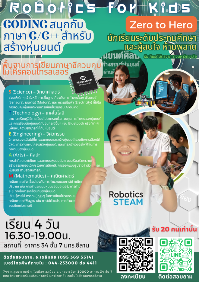 ในยุคดิจิทัลปี 2025 การเขียนโปรแกรมภาษา C/C++ เป็นทักษะสำคัญที่ช่วยให้เด็กอายุ 10-15 ปีเข้าใจโครงสร้างพื้นฐานของภาษาการเขียนโปรแกรมสมัยใหม่ และสามารถประยุกต์ใช้ควบคุมไมโครคอนโทรลเลอร์ เช่น Arduino เพื่อสร้างหุ่นยนต์ที่เชื่อมโยงกับเทคโนโลยี IoT โครงการนี้มุ่งพัฒนาทักษะการเขียนโค้ด C/C++ อย่างเป็นระบบ ครอบคลุมตัวแปร, เงื่อนไข, ลูป, ฟังก์ชัน, อาร์เรย์ และพอยน์เตอร์ ผ่านโปรเจกต์หุ่นยนต์ที่สนุกสนาน เช่น รถเคลื่อนที่หรือแขนกล โดยใช้แนวทาง STEAM เพื่อส่งเสริมการคิดเชิงตรรกะ ความคิดสร้างสรรค์ และการแก้ปัญหา การเรียนรู้ผ่านผลลัพธ์ที่จับต้องได้ เช่น การควบคุม LED, มอเตอร์ หรือเซนเซอร์ ช่วยกระตุ้นความสนใจและสร้างแรงบันดาลใจให้เด็กพัฒนานวัตกรรมในอนาคต โครงการนี้ตอบสนองความต้องการของสังคมยุคใหม่ที่เน้นทักษะด้านวิทยาการคอมพิวเตอร์และวิศวกรรมหุ่นยนต์